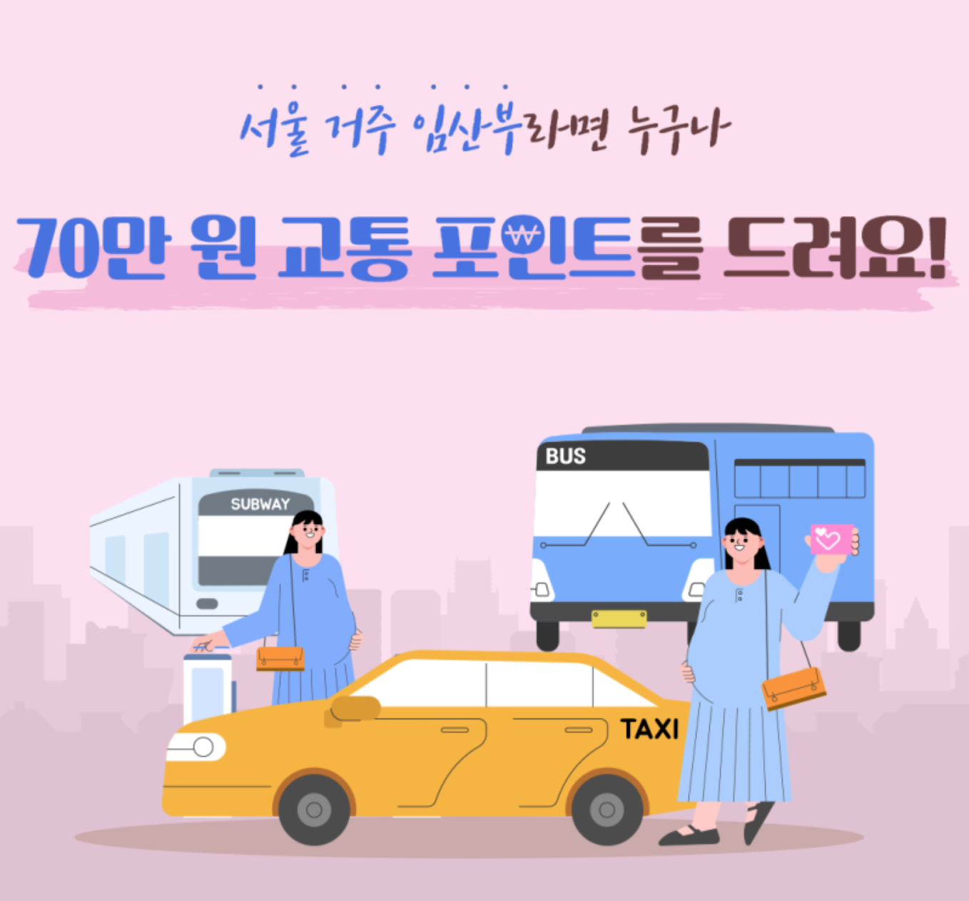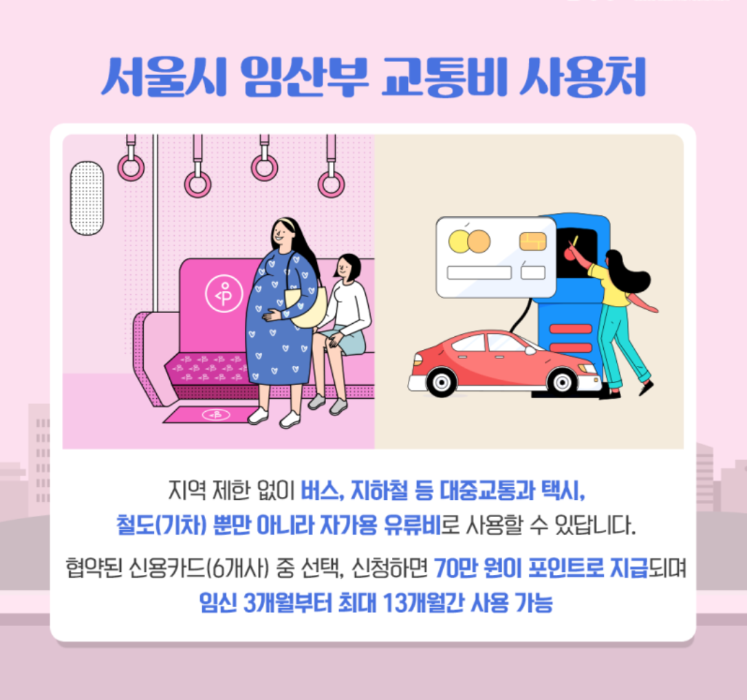 현재 서울에 거주하는 임산부라면 누구나 70만 원을 교통비를 지원(다문화가족 외국인 임산부 포함)